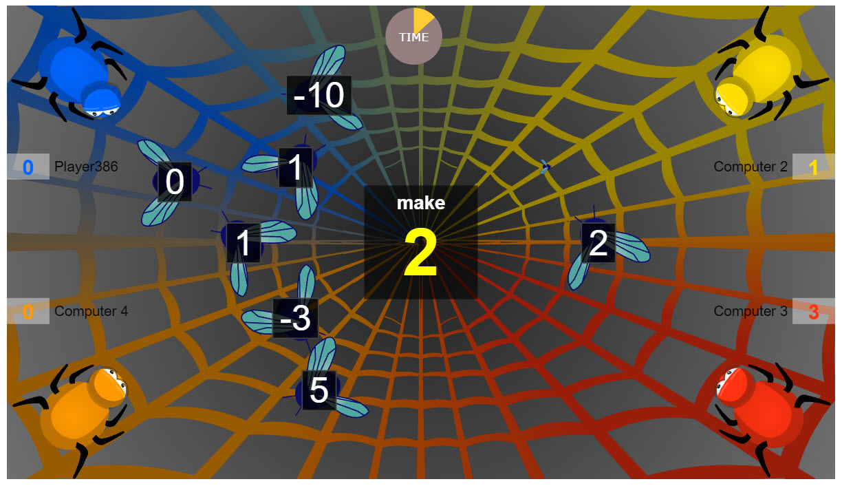 این بازی هم مثل بازی سفینه فضایی چهار نفره است و اگر فرد آنلاین دیگری وجود نداشته باشد با سیستم بازی میکنید. در این بازی یک عدد در وسط تار عنکبوت داده شده و شما باید با کمک اعدادی که روی تار ظاهر میشوند، عدد خواسته شده را بسازید. باید دو یا چند عدد انتخاب کنید که جمع آنها عدد وسط تار شود. در این بازی سرعت عمل شما در جمع اعداد صحیح بسیار مهم است.