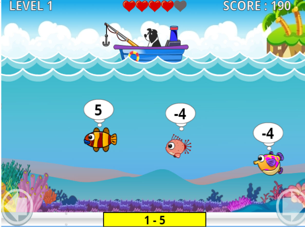 در این بازی آنلاین آموزشی ریاضی، در پایین صفحه کادر زرد یک محاتسبه اعداد صحیح قرار دارد که شما باید ماهی با جواب صحیح را صید کنید. روی صفحه کلیک کنید تا قلاب پایین بیاید.
