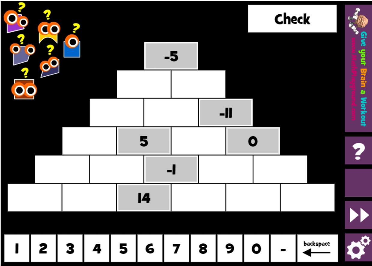 این یک بازی جالب و فکری برای جمع و تفریق اعداد صحیح است. الگویی بین اعداد هرم برقرار است. طبق این الگو مجموع دو عدد کنار هم عدد بالایی را میسازد. حال با توجه به این الگو شما باید جاهای خالی را پر کنید. برای نوشتن عدد مناسب از کلیدهای پایین صفحه استفاده کنید. برای شروع بازی روی صفحه کلیک کنید.