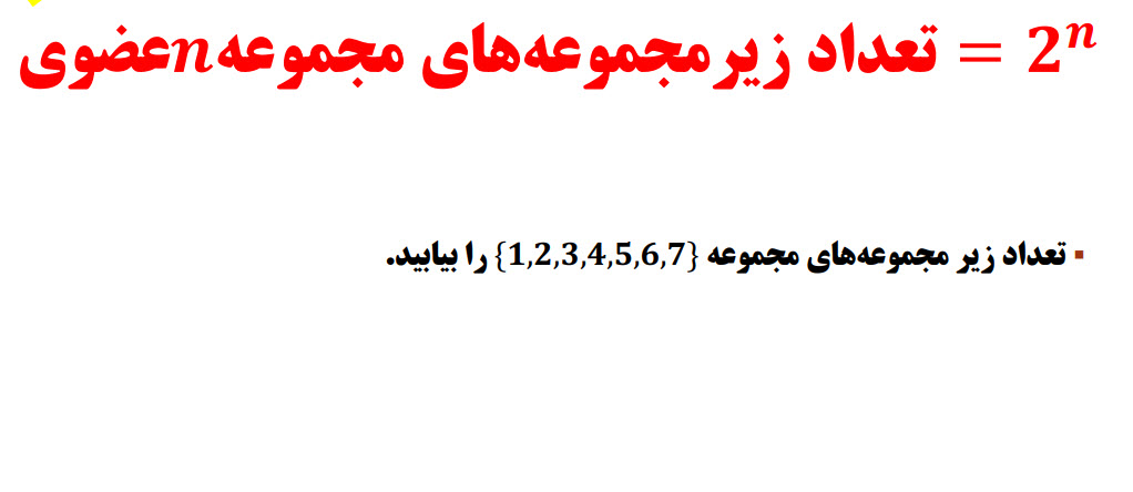چگونه می‌توان همه زیرمجموعه‌های یک مجموعه را نوشت؟ پس از آن‌که نشان دادیم چگونه به صورت منظم همه زیر مجموعه‌های یک مجموعه را بنویسیم، الگویی برای تعداد زیرمجموعه‌های یک مجموعه کشف می‌کنیم و با این فرمول می‌توان تعداد زیر مجموعه‌های یک مجموعه با تعداد اعضای بالا را سریع محاسبه کرد. با این فرمول می‌توان سوال‌های جالبی مطرح کرد که در سوالات تکمیلی مطرح می‌شود و برای موفقیت در آزمون‌ تیزهوشان و ورودی مدارس نمونه دولتی مهم است.