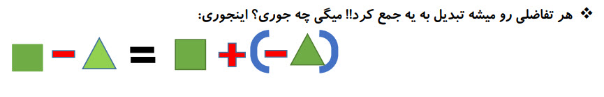 نکته مهم این است که تمام قواعد و روشهایی که در این فصل یاد میگیریم در مورد جمع است! برای تفریق باید ابتدا آن را به جمع تبدیل کرده و سپس حاصل آن را بیابیم. تکنیک تبدیل تفریق به جمع را در این ویدیو توضیح دادهایم.