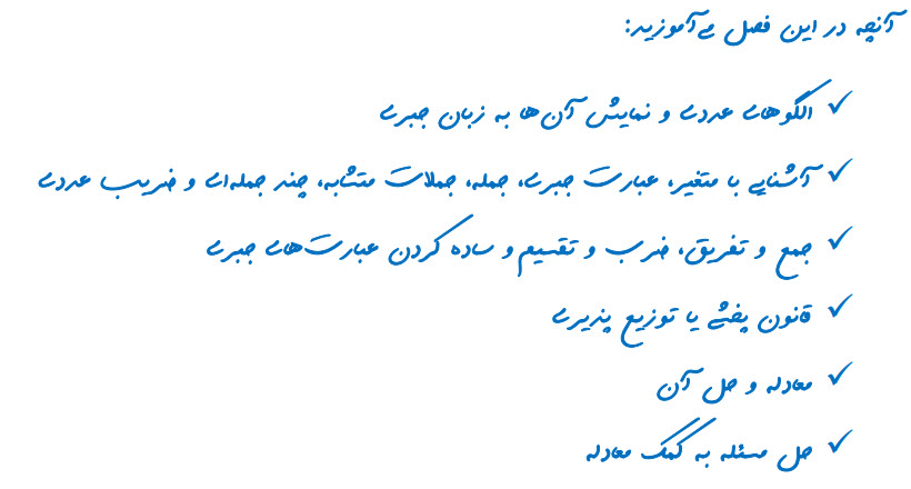 فصل سوم ریاضی پایه هفتم درمورد جبر و معادله است. این اولین بار است که شما دانشآموزان پایه هفتم به دنیای جبر قدم میگذارید. باید مفاهیم اولیه جبر را به خوبی بشناسید زیرا بخش زیادی از ریاضی که سالهای آینده میآموزید بر پایه همین درس است. شما در انتهای این فصل باید با مفاهیم زیر آشنا خواهید شد: